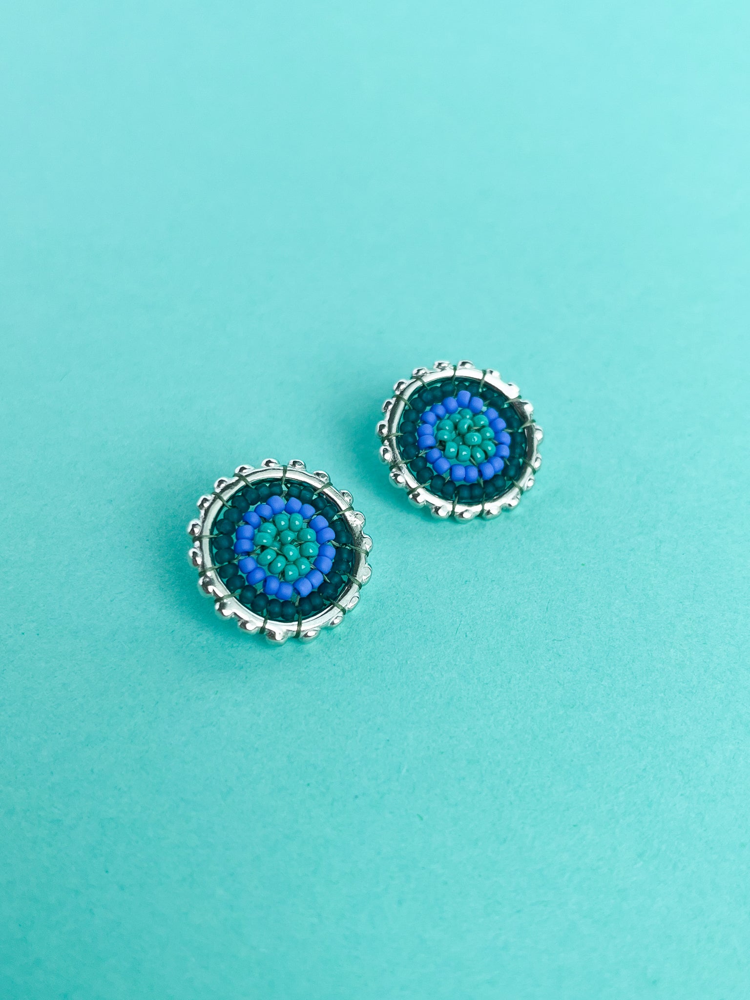 The Halo Loops – Silver Beaded bring a fun pop of color to a classic, textured design. Handcrafted from recycled sterling silver (.925), each loop is beaded with Japanese glass seed beads in vibrant shades of blue and green, giving them a fresh, playful look with a subtle retro vibe.