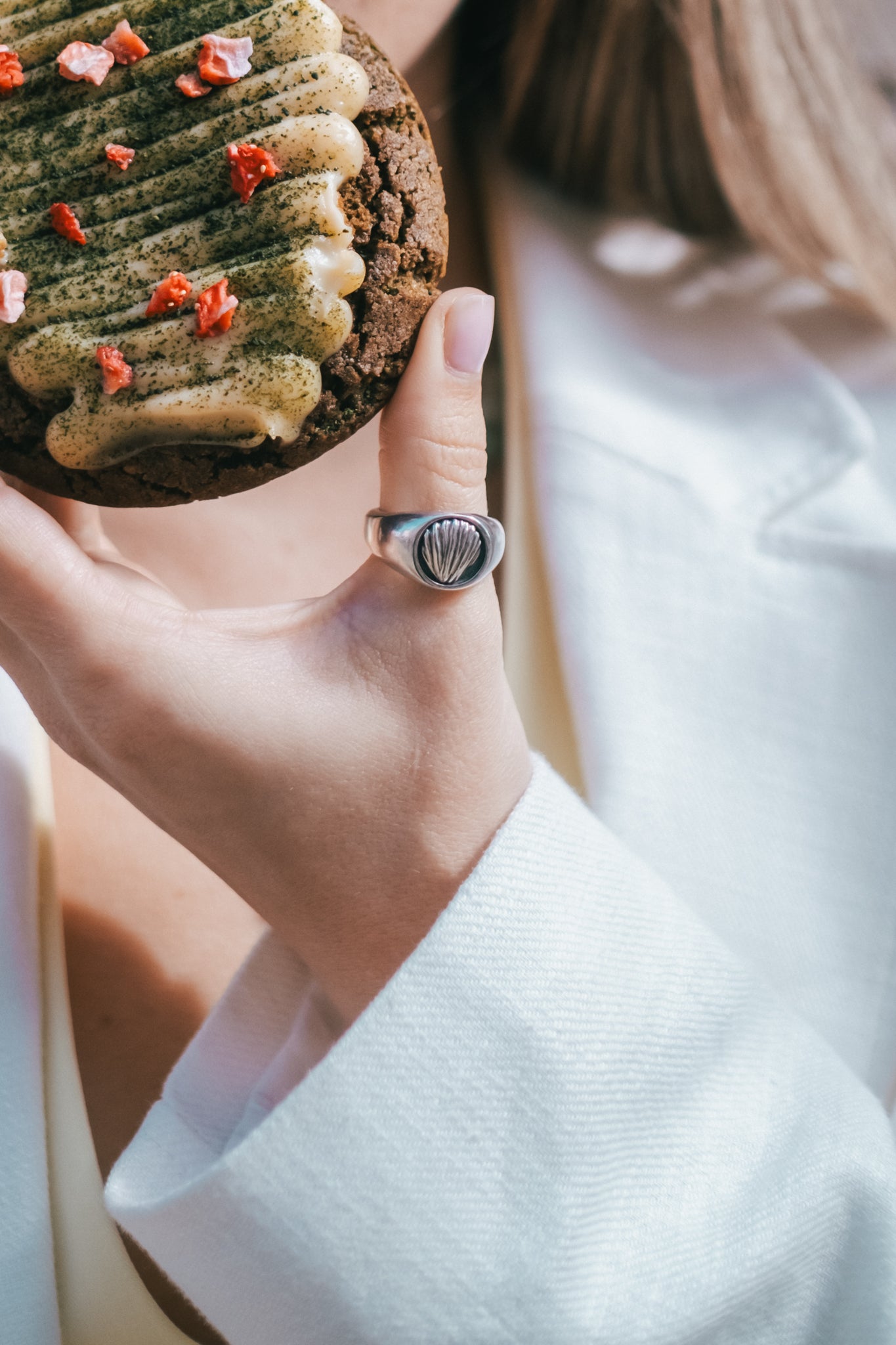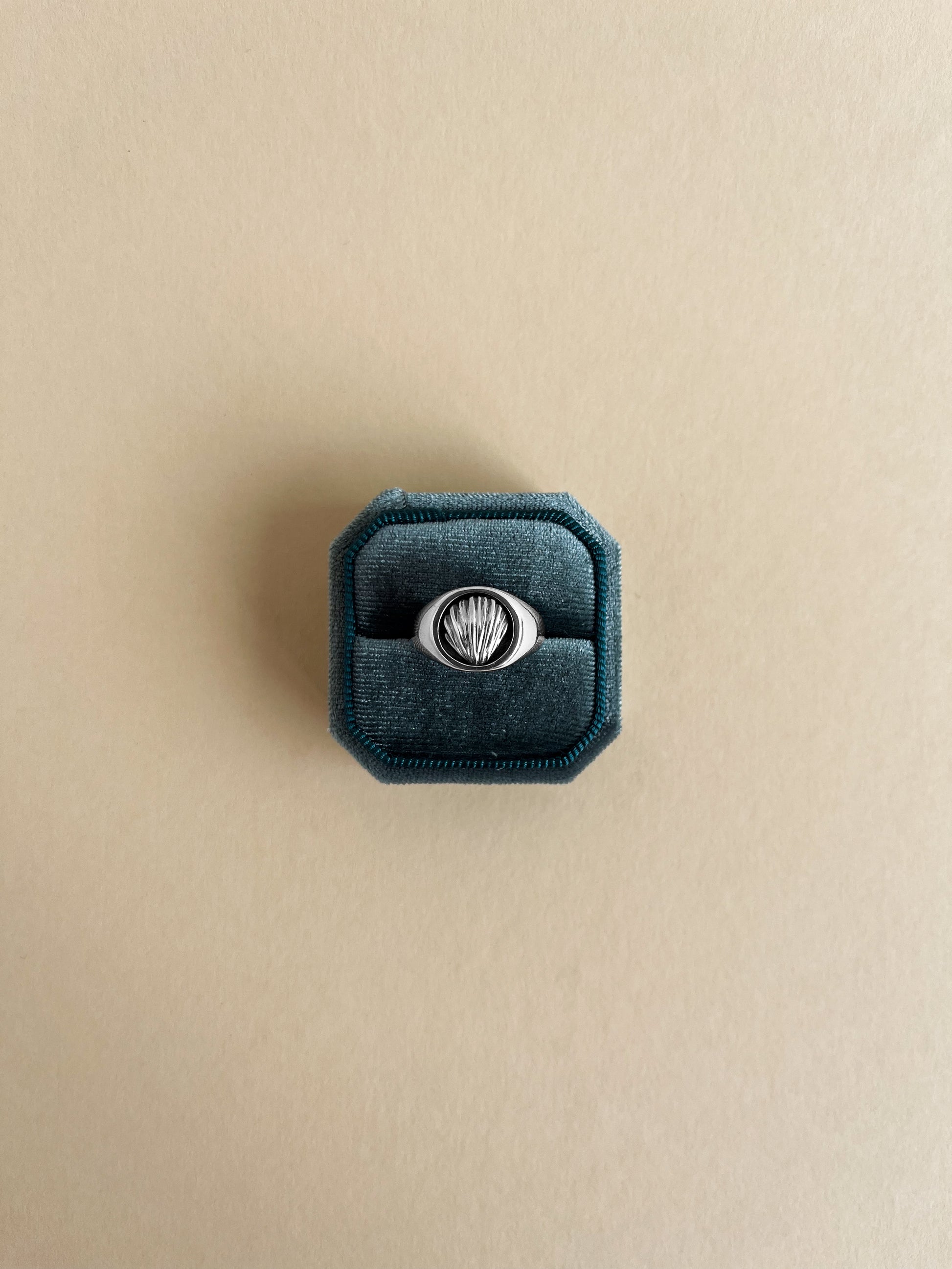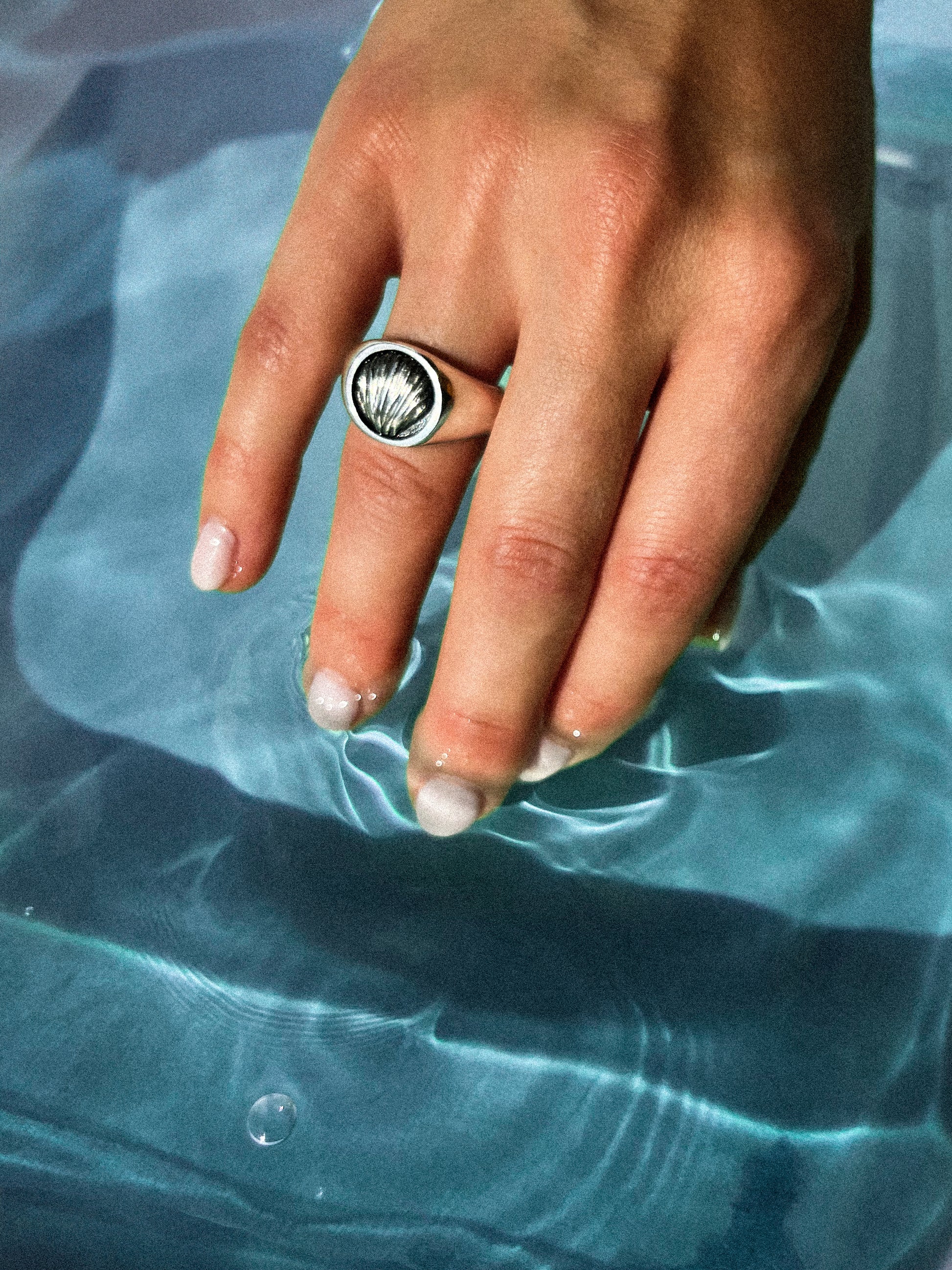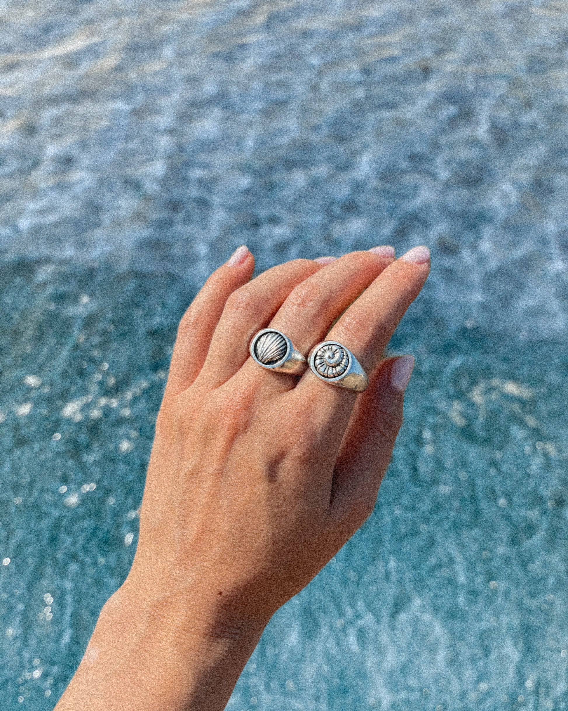 Handcrafted using the lost-wax casting method and made from recycled sterling silver (.925), this heavy, completely solid signet-style ring carries the unique texture and curves of a scallop shell. Each ring is hand-carved with care, making it a unique reflection of nature’s perfect imperfections.