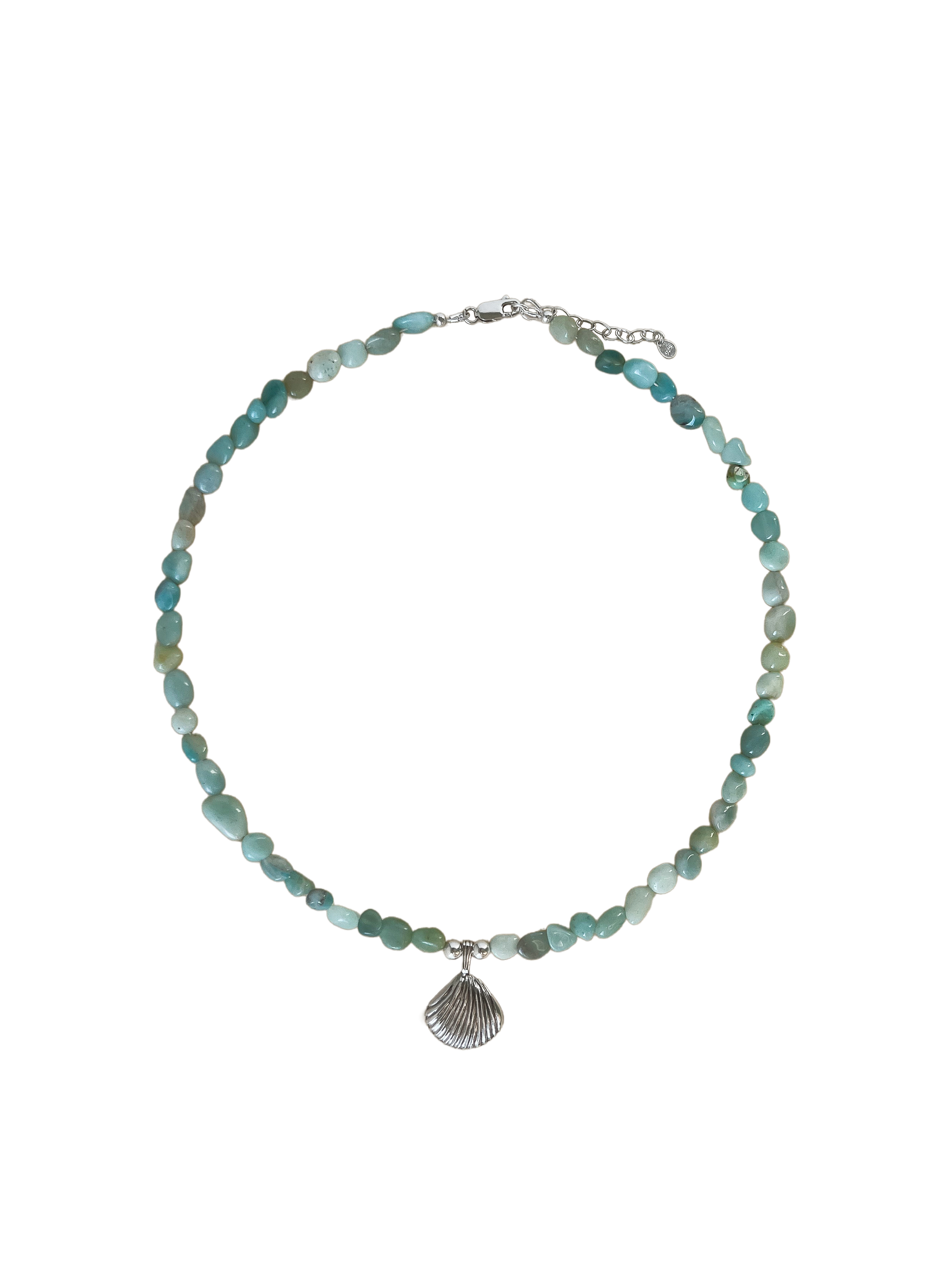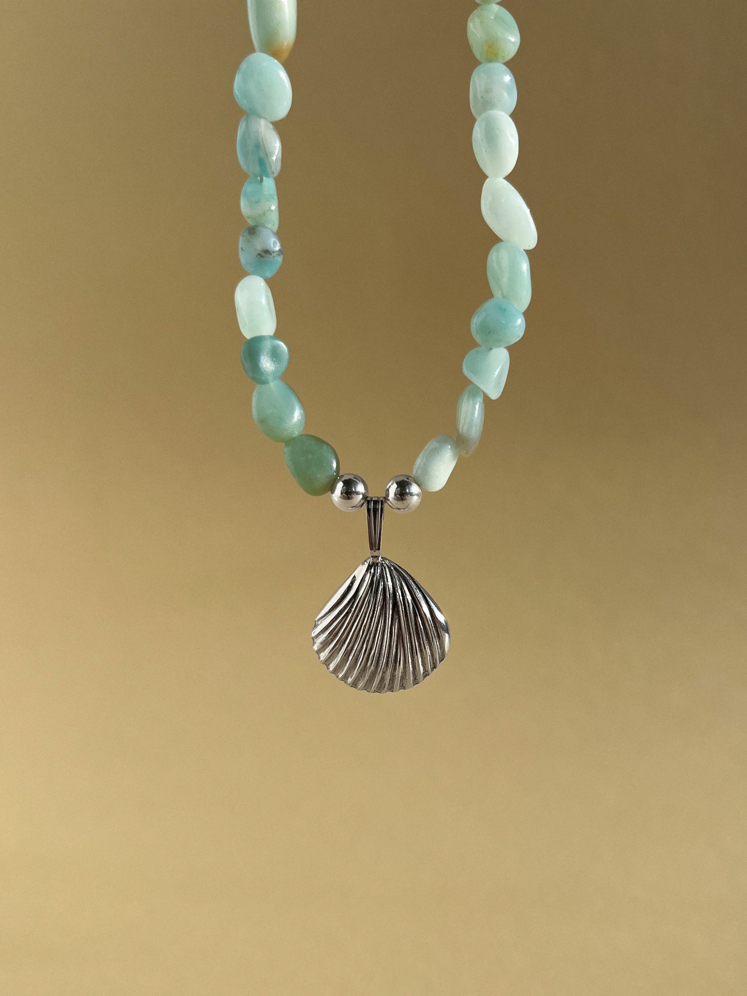 The Scallop Shell Necklace brings a piece of coastal beauty to your style. Handcrafted from recycled sterling silver (.925) using the lost-wax casting technique, this pendant captures the natural ridges and curves of a scallop shell, symbolizing strength and resilience. Strung with vibrant blue amazonite nuggets, the necklace brings a touch of ocean color to your look, perfect for a subtle statement.